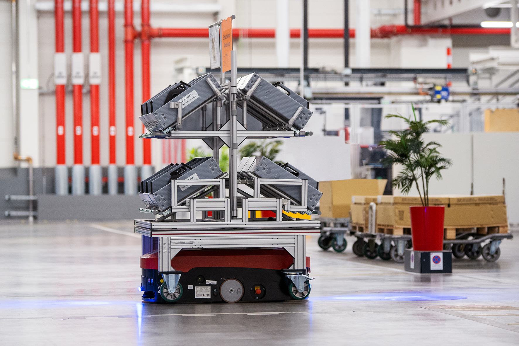 Caption 1 + 2 + 3: item material supply trolleys made from components in the item building kit systems are compatible with AUDI AG’s automated guided vehicles and support flexible configuration.